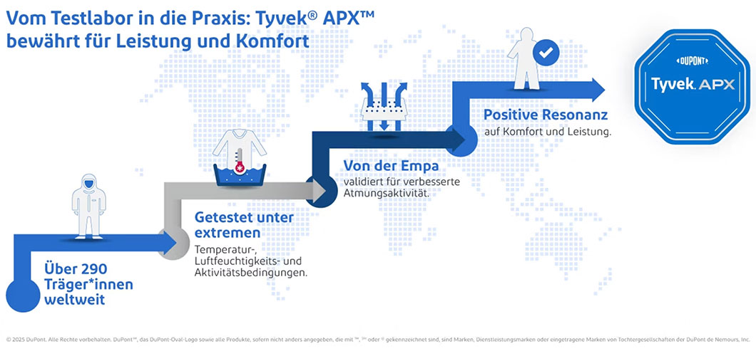 Beim Tyvek® APX™ stehen Schutz um Komfort im Mittelpunkt. Das Material ist extrem atmungsaktiv und ermöglicht eine verbesserte Feuchtigkeitsverdunstung und Luftzirkulation. Diese Eigenschaften wurden wissenschaftlich von unabhängigen Labors validiert, unter anderem der Empa (Eidgenössische Materialprüfungs- und Forschungsanstalt). Darüber hinaus wurden Tragetests mit Kunden durchgeführt, um Benutzerbewertungen zu sammeln und zu berücksichtigen.