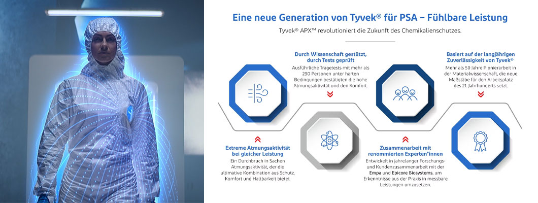 Mit den Tyvek® APX™-Schutzanzügen hebt DuPont™ den Tragekomfort im Bereich Chemikalienschutz auf das nächste Level. Das Material ist besonders atmungsaktiv. Damit erleben Anwender eine ultimative Kombination aus Schutz und Komfort.